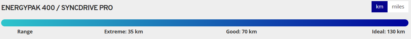 Bara de mai jos oferă o gamă aproximativă. Condițiile sunt categorisite ca fiind extreme, bune și ideale. Condițiile extreme apar în mod obișnuit atunci când călătorești cu o încărcătură grea, vânturi puternice sau pante excesive.